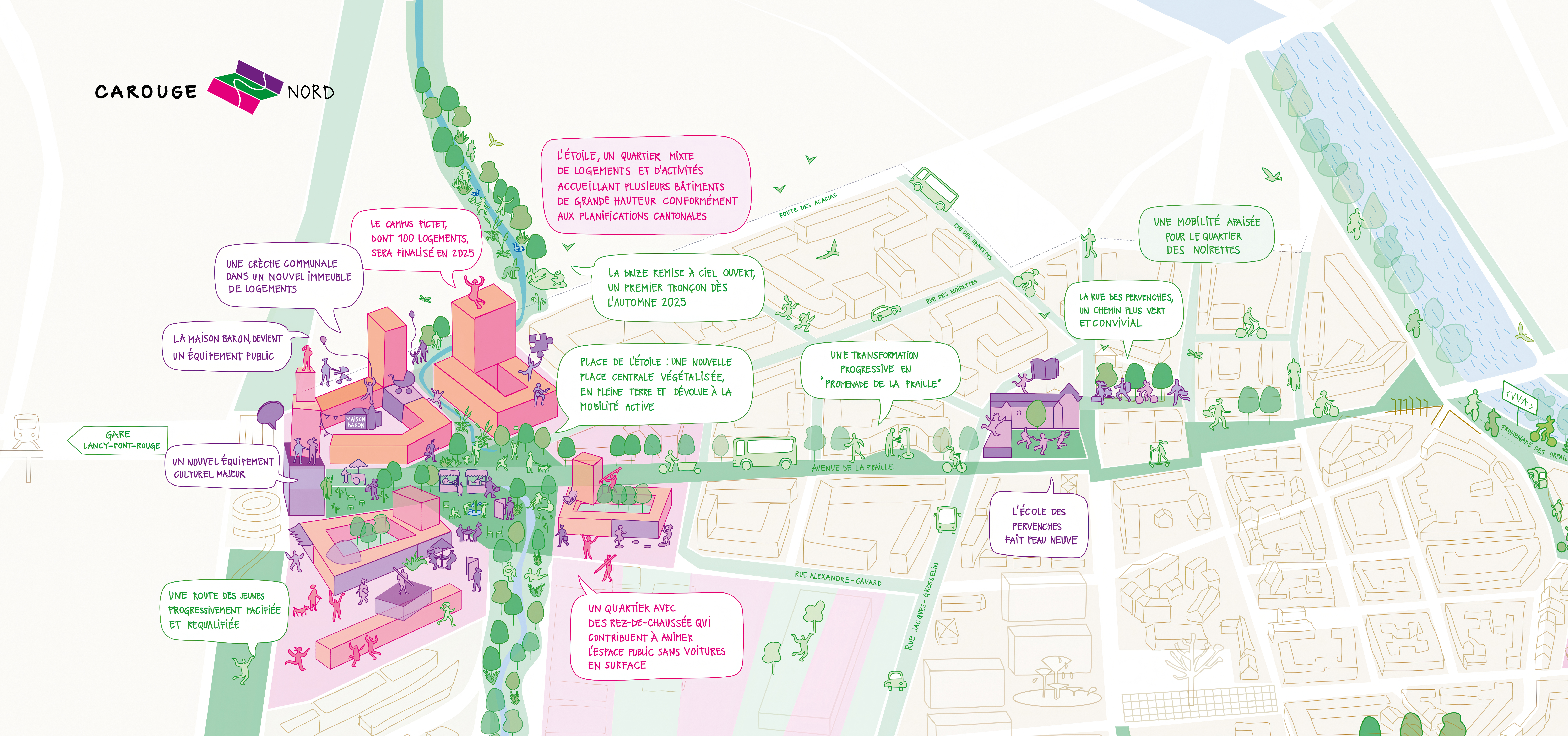 L’ambition communale vise une grande qualité paysagère des espaces publics, qui seront dévolus aux mobilités actives et aux transports publics. Afin d’accompagner l’arrivée de nouveaux habitantes et habitants, la Ville de Carouge anticipe la création de nouveaux équipements publics.