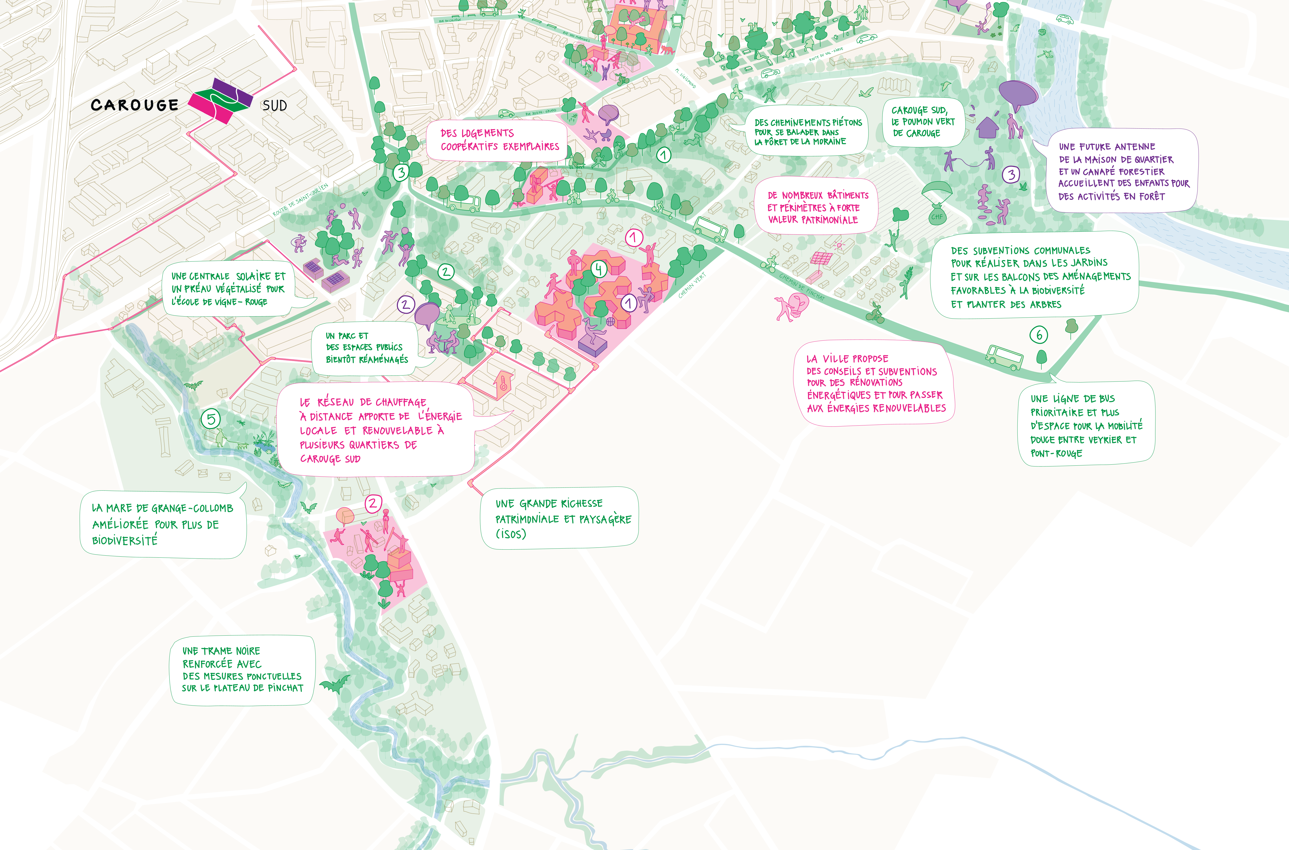 Situé sur le plateau de Pinchat, le secteur Carouge-Sud représente le «poumon vert» de Carouge. Ce secteur comprend autant des quartiers constitués tels que Battelle et Tambourine, dont le parc et les espaces publics seront bientôt réaménagés, que des quartiers en devenir (Université, Bief-à-Dance). S’y ajoutent la zone villa et les espaces naturels protégés tels que la forêt de protection de la Moraine et des bords de l’Arve ainsi que la Drize.